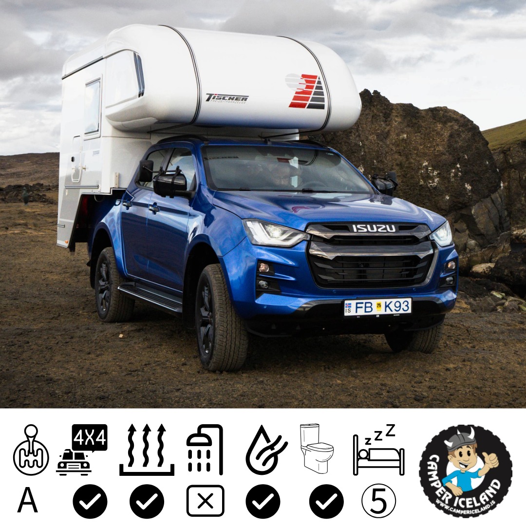 Der 4×4 Camper Thor ist ein toller und moderner Camper, der wirtschaftliche Pickups (wie Toyota, Isuzu) mit einem neuen deutschen Hard-Side Camper kombiniert. Er ist die ideale Lösung für „Overlanding“ und die Erkundung ganz Islands, einschliesslich der Hochlandregionen. Ein normaler Führerschein ist ausreichend. Der Camper verfügt über einen Aluminiumrahmen und ist bestens für Ihren Islandurlaub ausgestattet, inklusive Propangas für Kochen und Heizen (TRUMA Heizung), Kühlschrank (12V, Ladung während der Fahrt und via Solarpanel), Kaltwassersystem, 2-Flammen-Kochfeld und tragbarer Toilette. Modelle wie Mitsubishi L200 oder Toyota Hilux sind mit Diesel- oder Benzinmotor, Automatik-/Schaltgetriebe und SuperSelect 4×4 erhältlich. Im Gegensatz zum 4×4-Camper TYR hat der THOR ein portables WC und ein manuelles Getriebe (Handschaltung).